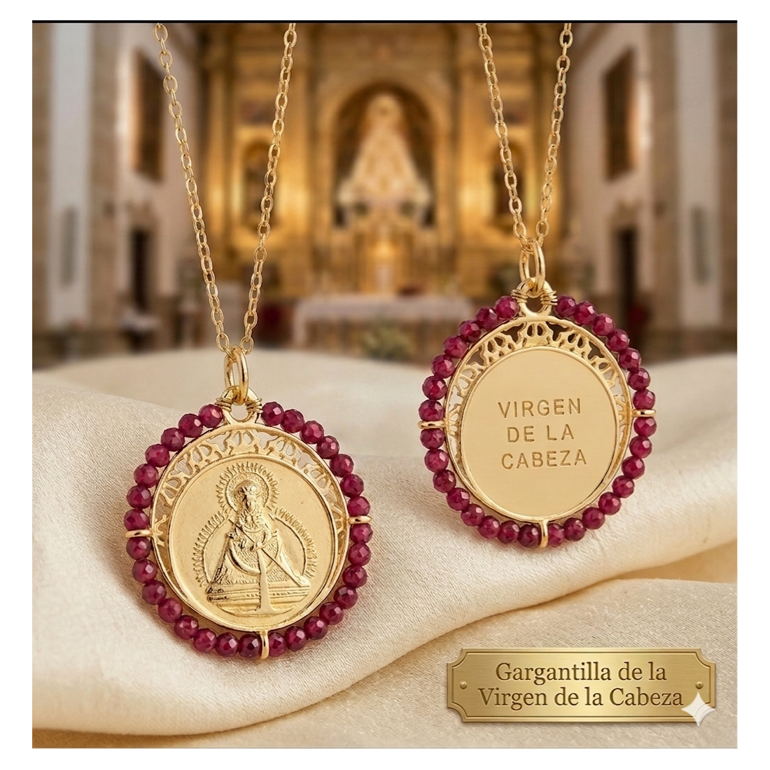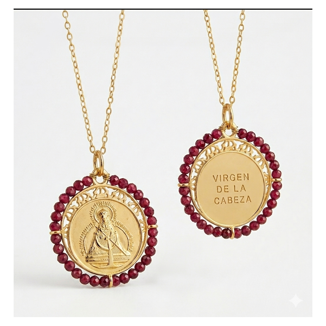 Delicada medalla de Plata de Ley chapada en oro de la Virgen de la Cabeza, Patrona de Andujar.