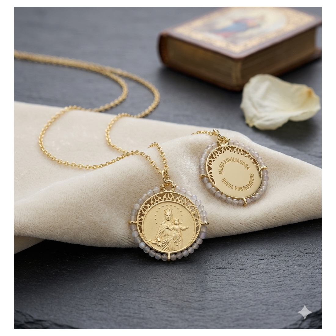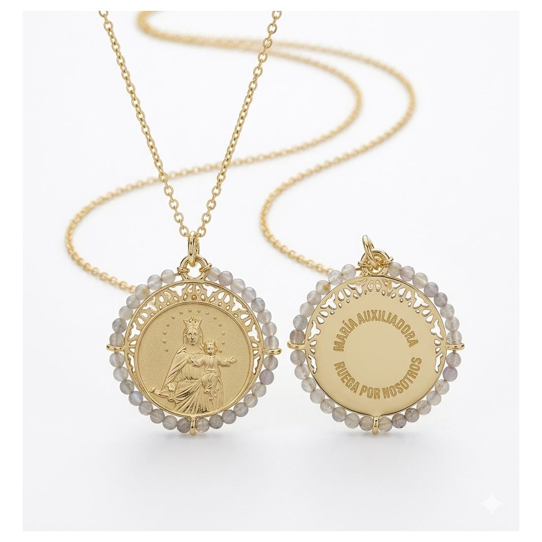 La rocalla de labradorita natural (Ø2 mm) aporta una nota de espiritualidad única: sus destellos azulados —la llamada labradorescencia— han sido históricamente asociados a la luz divina y la protección celestial. Por tratarse de una piedra de origen natural, cada ejemplar puede presentar sutiles variaciones de color, haciendo de cada medalla una pieza singular.