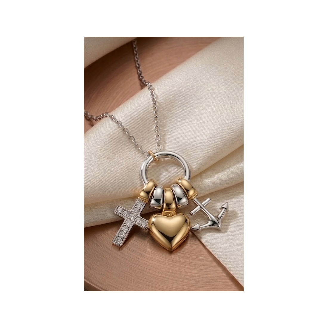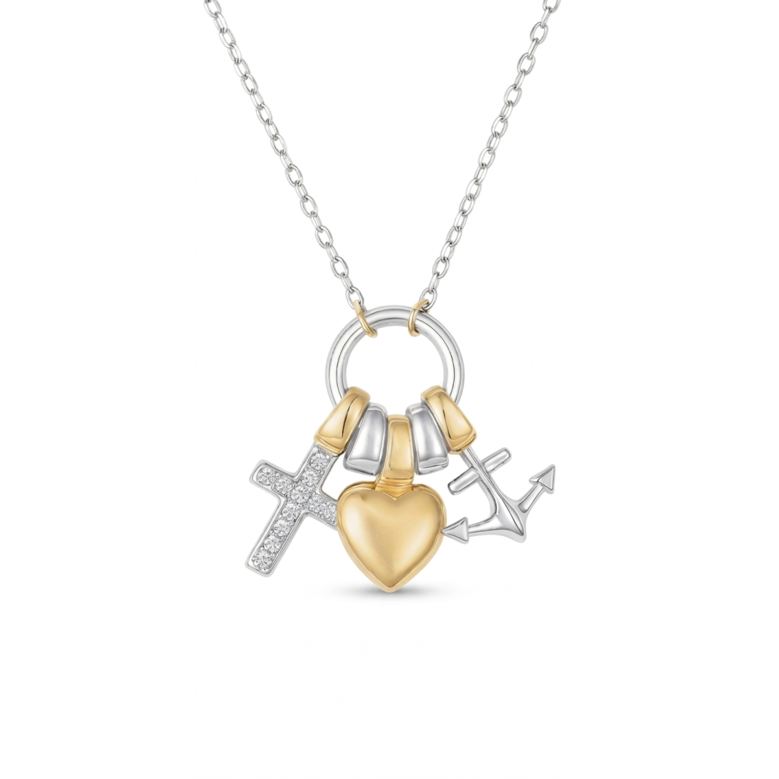 - Colgantes: Cruz pavimentada con circonitas blancas, corazón liso bañado en oro y ancla en plata