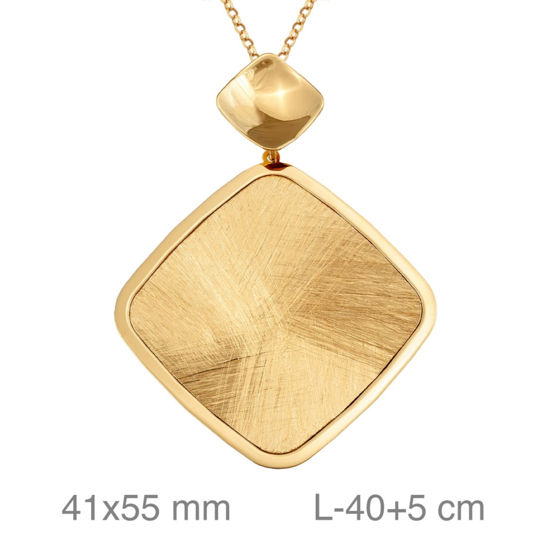 Gargantilla de plata de ley 925 chapada en oro 18k con gran colgante rombo geométrico. Centro cepillado y borde liso brillante. 41x55 mm. Cadena 40+5 cm. Una pieza de autor para looks sofisticados.