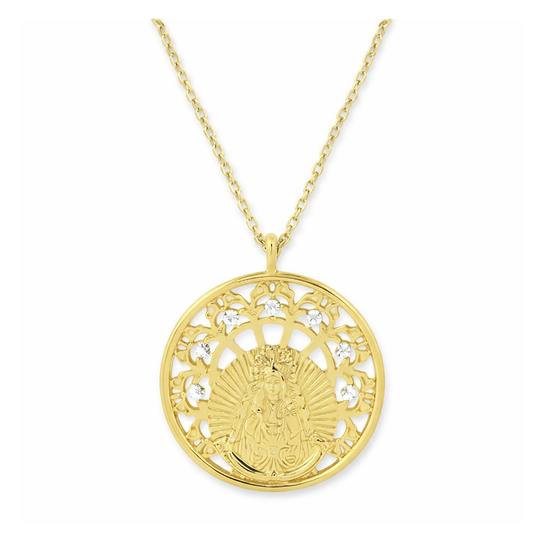 Gargantilla con medalla calada de la Virgen del Rocío de 22mm en Plata de Ley 925 bañada en oro 18k. Diseño circular con celosía floral y circonitas engastadas. Acabado brillante dorado. Ideal para comunión, bautizo o regalo devocional.