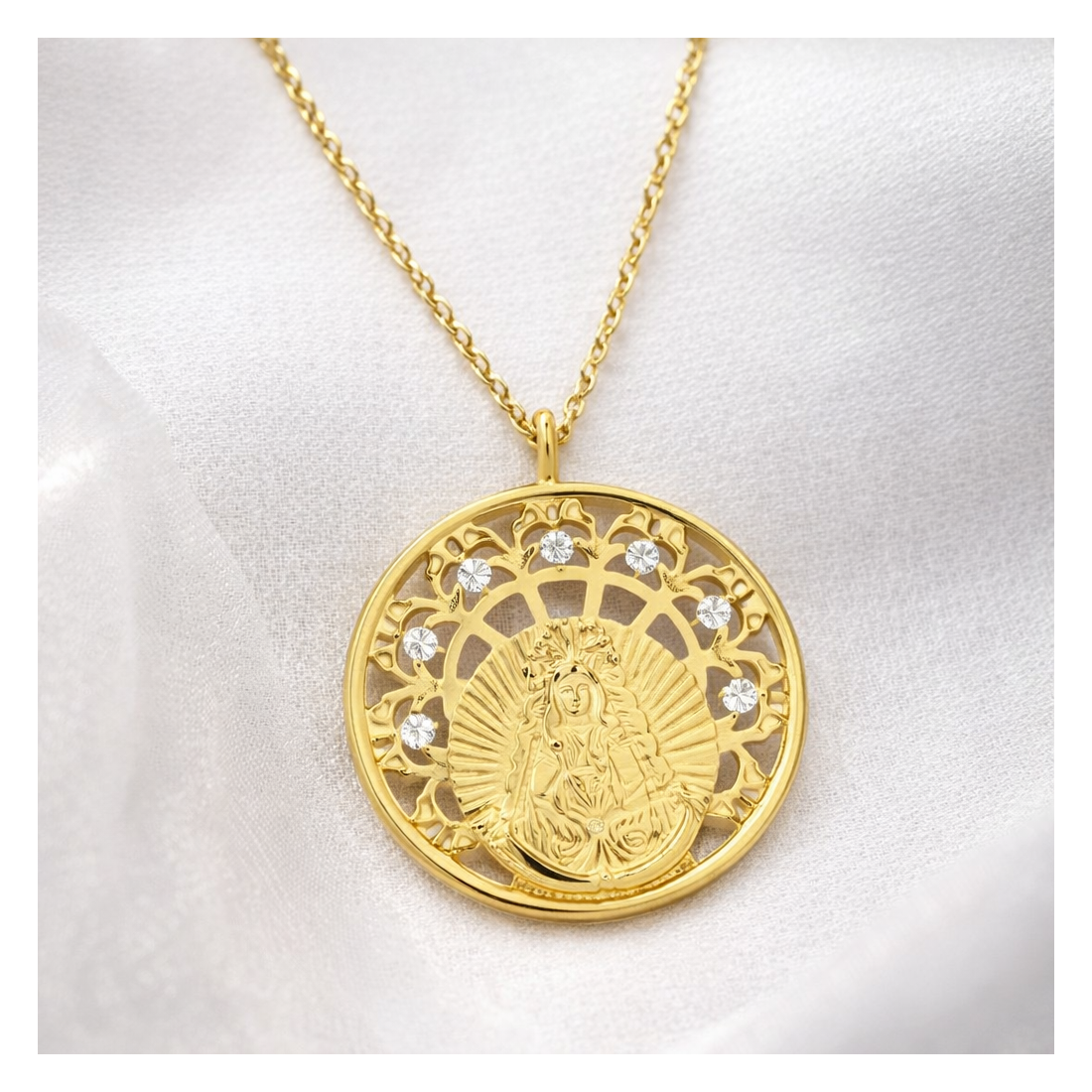 Elegante gargantilla devocional con medalla circular calada de 22 mm protagonizada por la imagen de la Virgen del Rocío. Elaborada en Plata de Ley 925 con baño de oro 18k, combina la tradición religiosa andaluza con un diseño joyero de alta calidad.