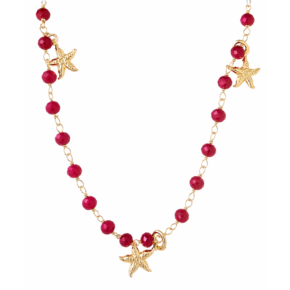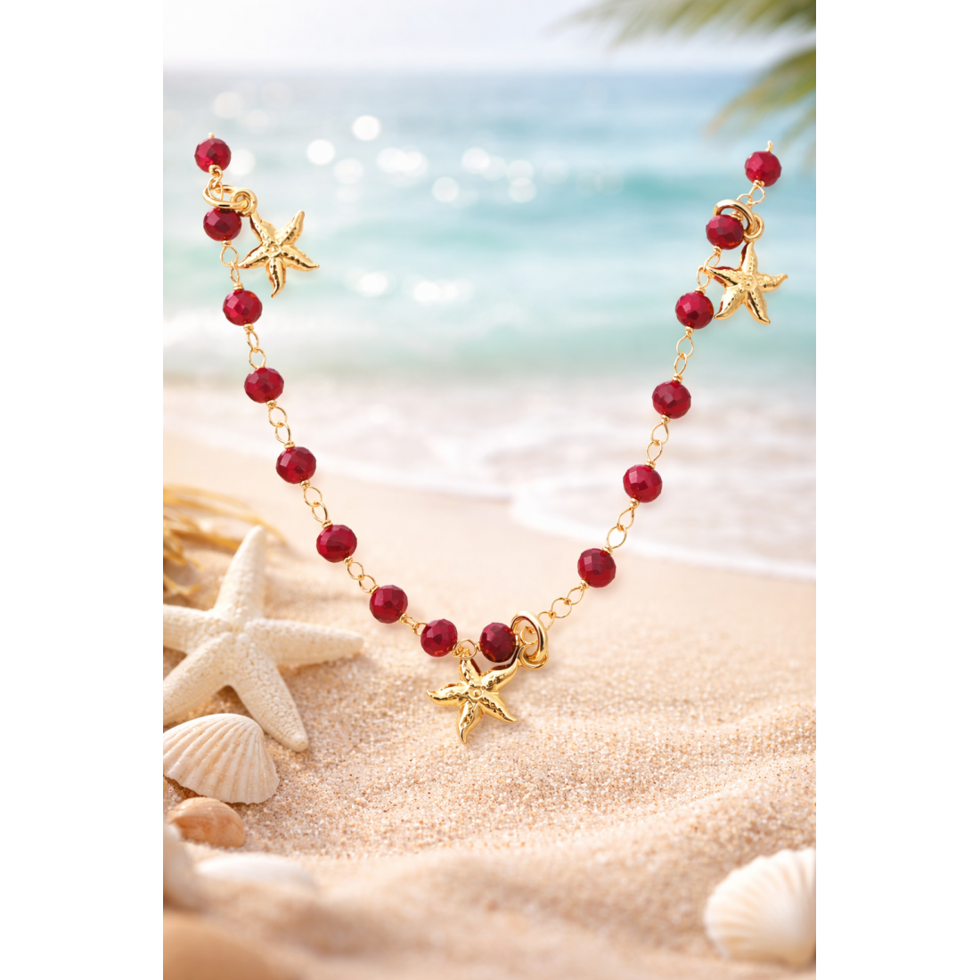 Una tobillera que captura la esencia del Mediterráneo: cuentas facetadas en rojo intenso engarzadas una a una sobre una delicada cadena bañada en oro, con tres charms de estrella de mar distribuidos a lo largo de la pieza.